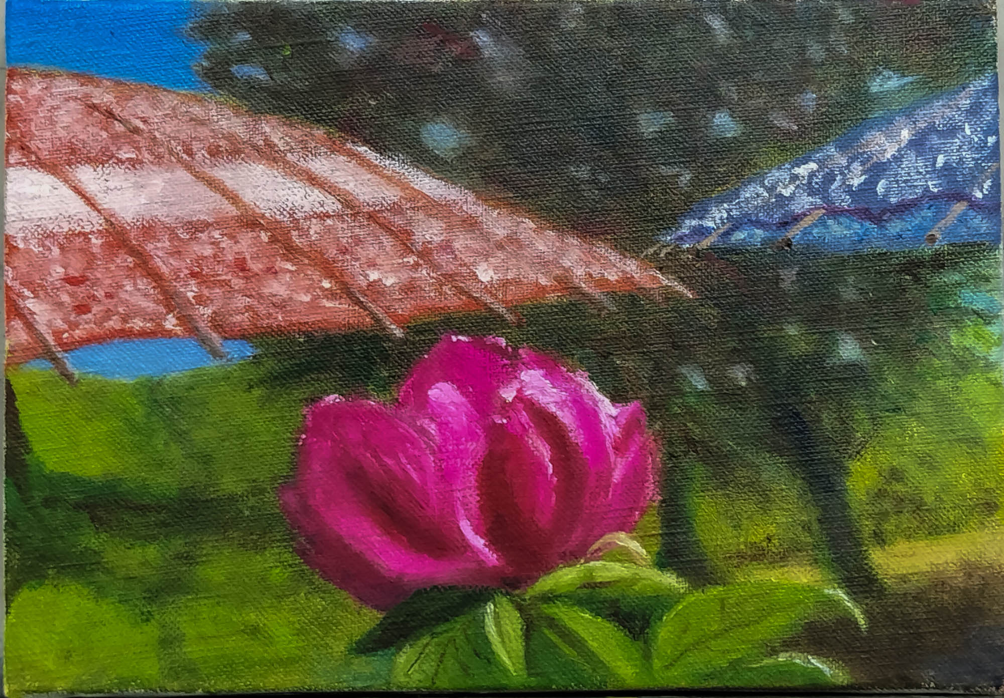 小さな牡丹の絵 アート1072 X Facebook LINE コピー 2026.03.23 絵の教室で4月にSMサイズという小さい絵の展覧会が開催されます。この展覧会のために牡丹と傘を描いた絵を丁度一ヶ月で完成させ、無事提出しました。 この絵は上野の牡丹園で撮った牡丹と傘の写真がベースです。 それに背景に少し手を加え、空間の広がりを作って絵にしました。 1072